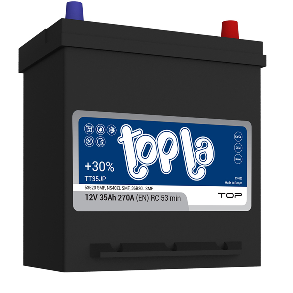 Topla Top JIS е батерија прозиведена со проширена метална технологија Ca/Ca и можности за стартување на највисоко ниво. Тоа е батерија со највисок квалитет што е погодна за возила со големи енергетски побарувања. Заради многу мала потрошувачка на вода и запечатена заштита, не е потребно никакво одржување.